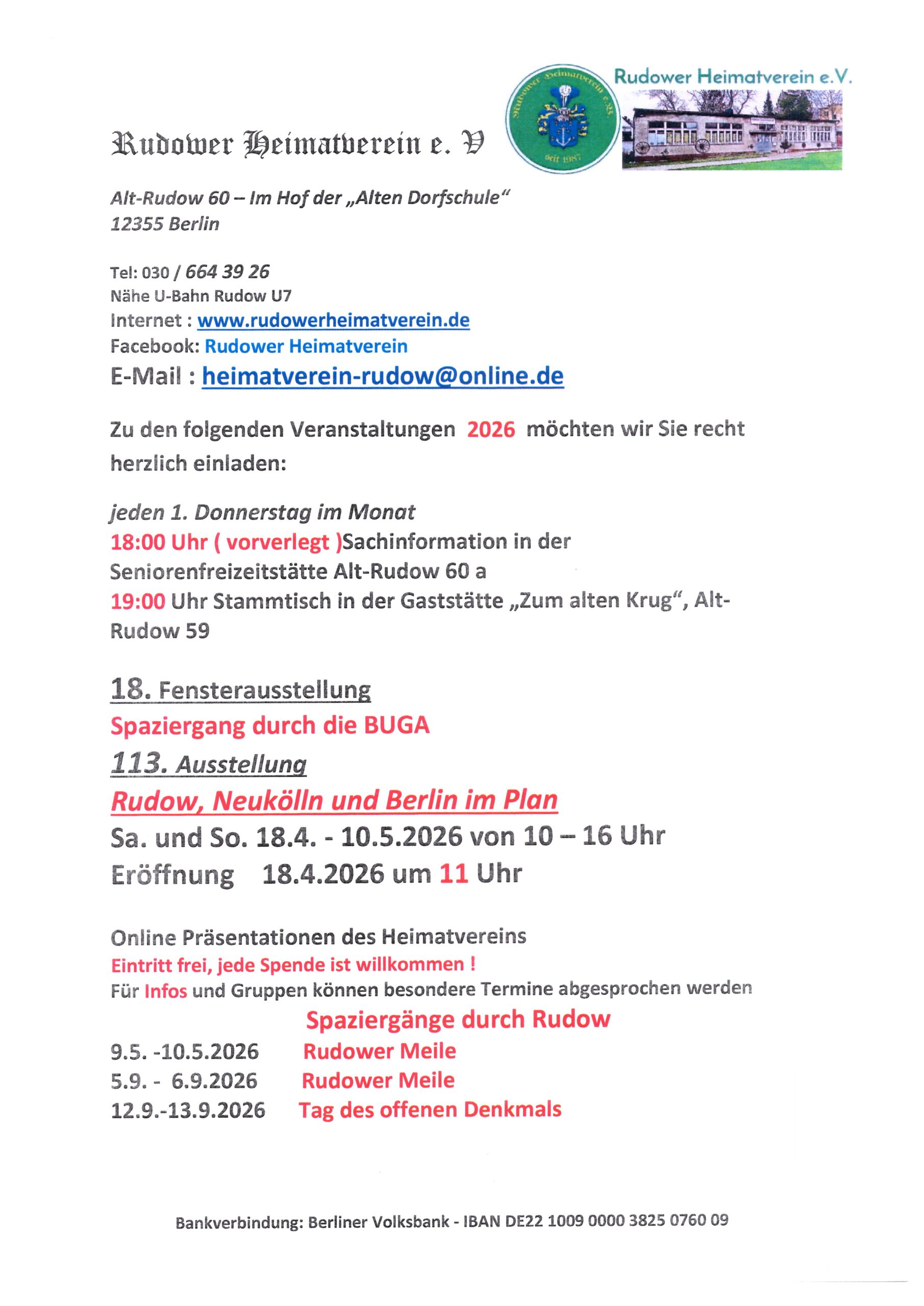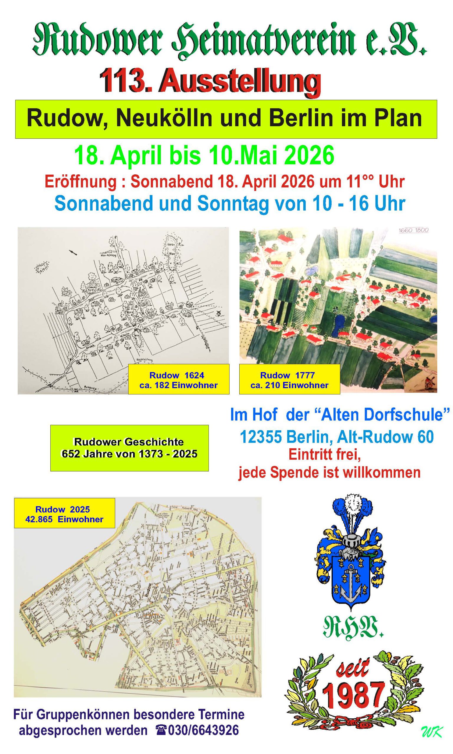 Eröffnung 18. April 2026, 11 Uhr, Gebäude des Heimatvereins auf dem Hof der Alten Dorfschule, Alt-Rudow 60